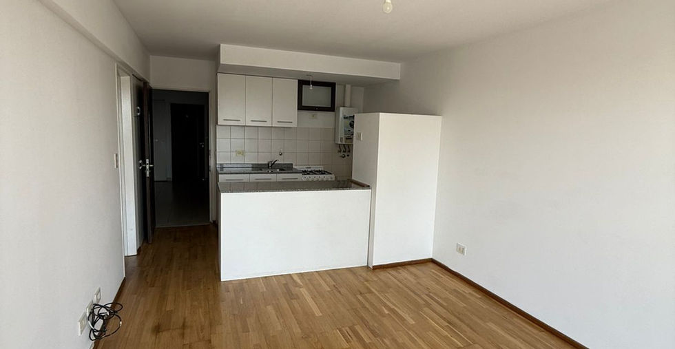 Living comedor con salida al balcón, cocina integrada, baño completo y un dormitorio.